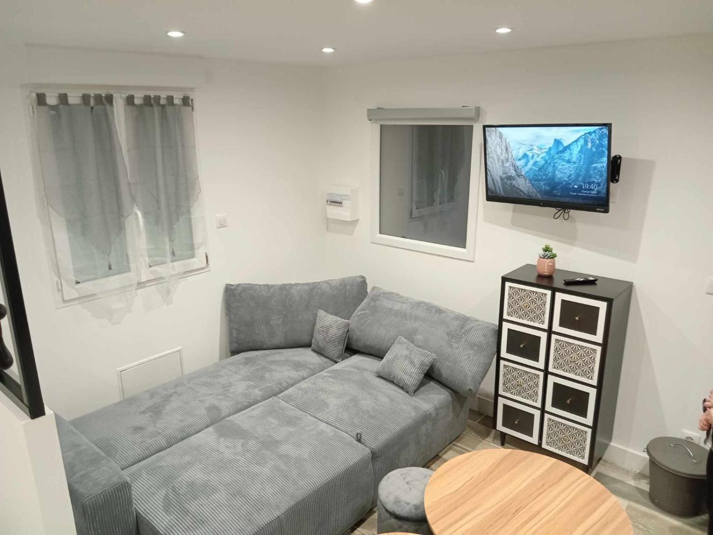 Appartement 1 Chambre. Featuring a private entrance, this apartment is comprised of 1 living room, 1 separate bedroom and 1 bathroom with a shower. In the kitchen, guests will find a stovetop, a refrigerator, kitchenware and a microwave. The apartment offers a tea and coffee maker, a seating area, a dining area, a sofa and a flat-screen TV with satellite channels. The unit offers 2 beds.