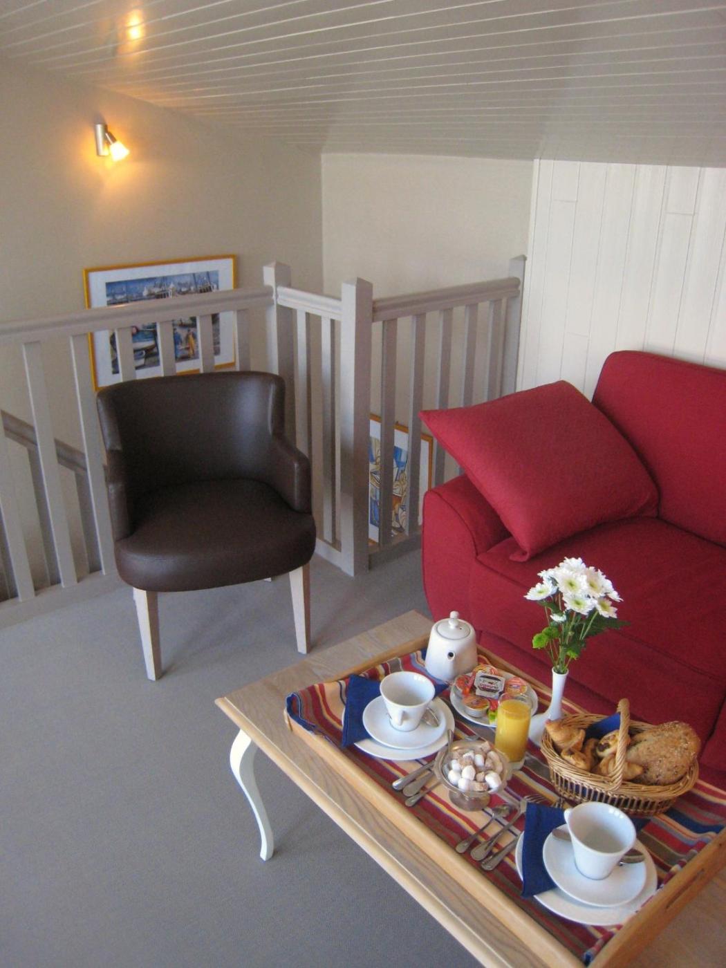 Chambre Familiale - Vue sur Mer. Cette chambre dispose dune mezzanine et dune pièce à vivre avec vue panoramique sur le port dAudierne. Cette chambre peut accueillir un lit dappoint ou un lit bébé moyennant des frais supplémentaires. ;