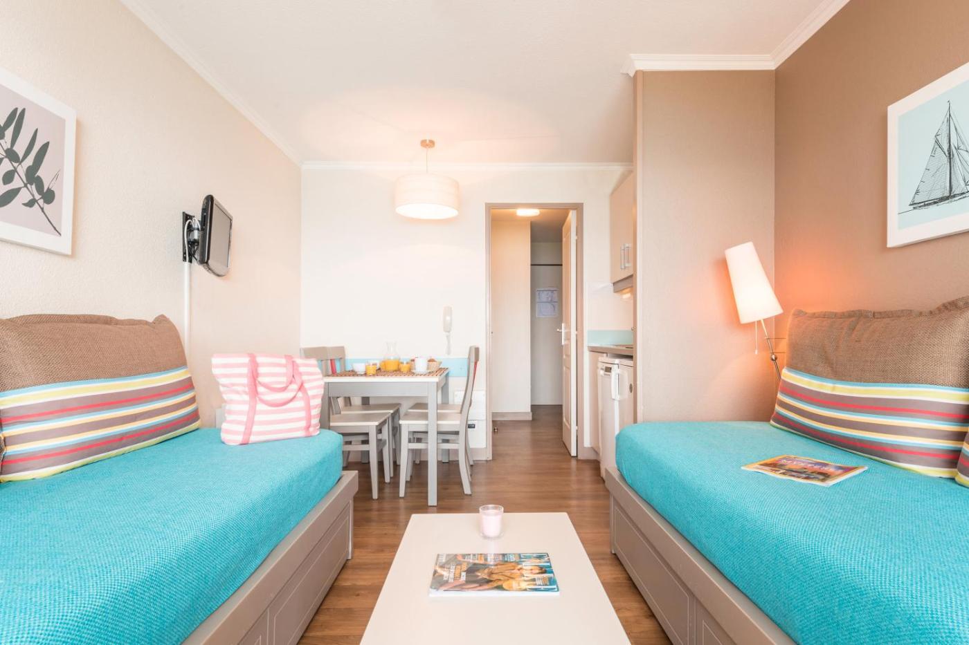 Appartement 1 Chambre – Vue sur Mer (4 Adultes). Cet appartement dispose d’une terrasse ou d’un balcon privés, d’un coin salon avec une télévision, d’une kitchenette entièrement équipée et d’une salle de bains privative. Pendant le Festival de Cannes 2018, un service de navette gratuit pour le Palais des festivals est assuré de 7h00 à minuit. ;