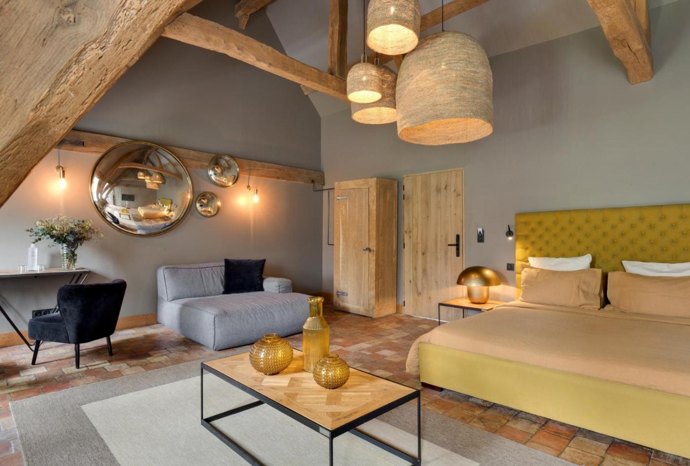 The Cottage - 4 stars hôtel La Chaumière.. Ce cottage est situé à quelques mètres de l’établissement principal et présente une décoration ainsi qu’une conception contemporaines. Offrant une vue sur la prairie et la mer, ce logement est doté dune chambre en mezzanine surplombant la baie de Seine, dun salon et dune salle de bains ouverte avec une douche à litalienne et une baignoire en tadelakt noir. ;