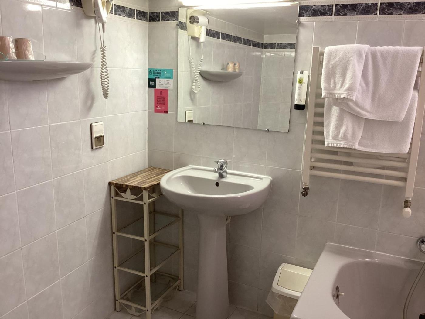 Chambre Triple. The triple room has a private bathroom fitted with a bath and a hairdryer. The air-conditioned triple room offers a flat-screen TV with satellite channels, a tea and coffee maker, a wardrobe, heating as well as ancourtyard view. The unit has 2 beds. ;