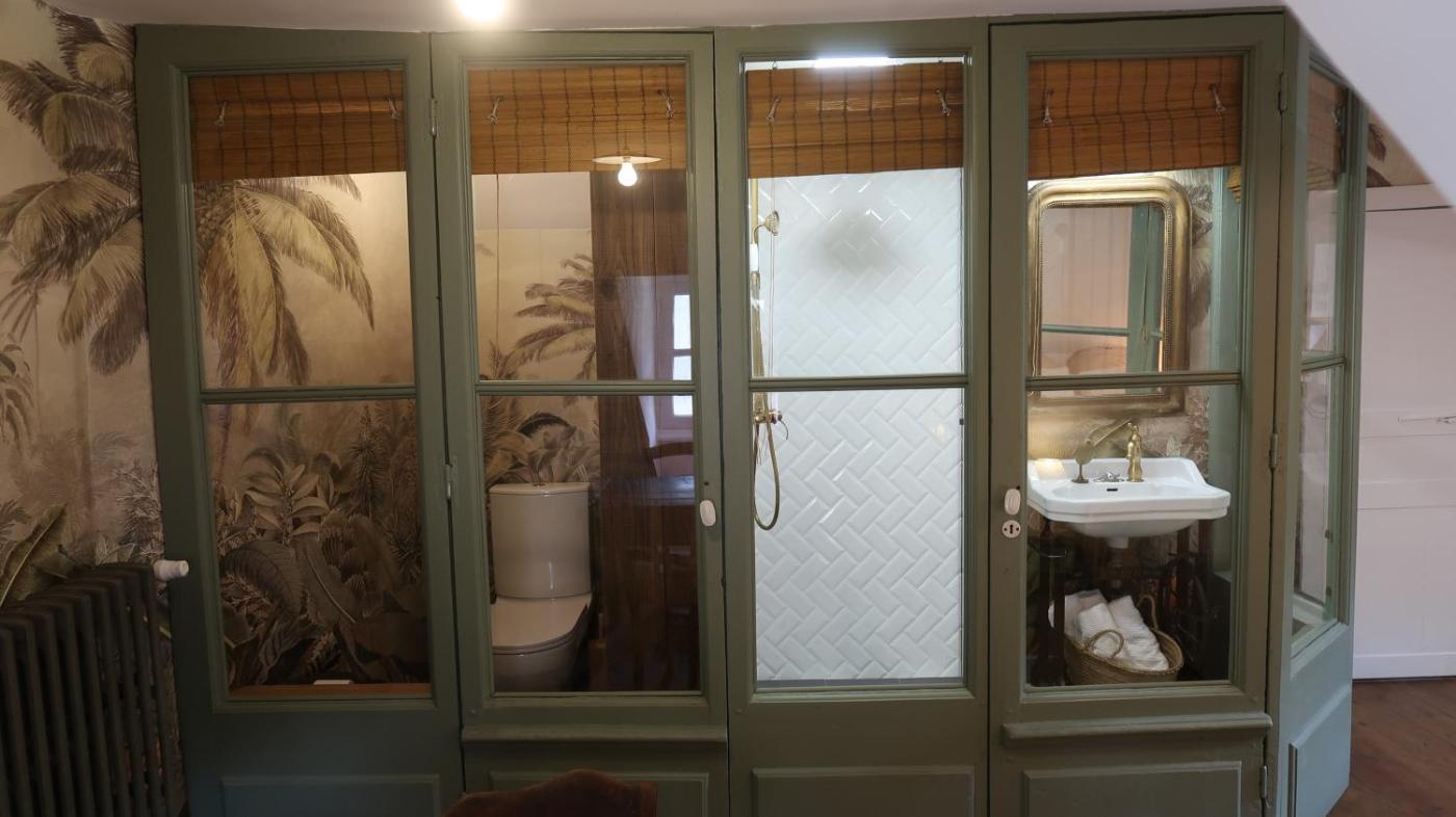 Chambre Double. The double room features a seating area, a dining area, as well as a private bathroom boasting a walk-in shower and a bath or a shower. Guests can make meals in the kitchenette that features a refrigerator, kitchenware and a microwave. The double room provides a wardrobe, parquet floors, as well as a terrace and an outdoor dining area. The unit has 1 bed.