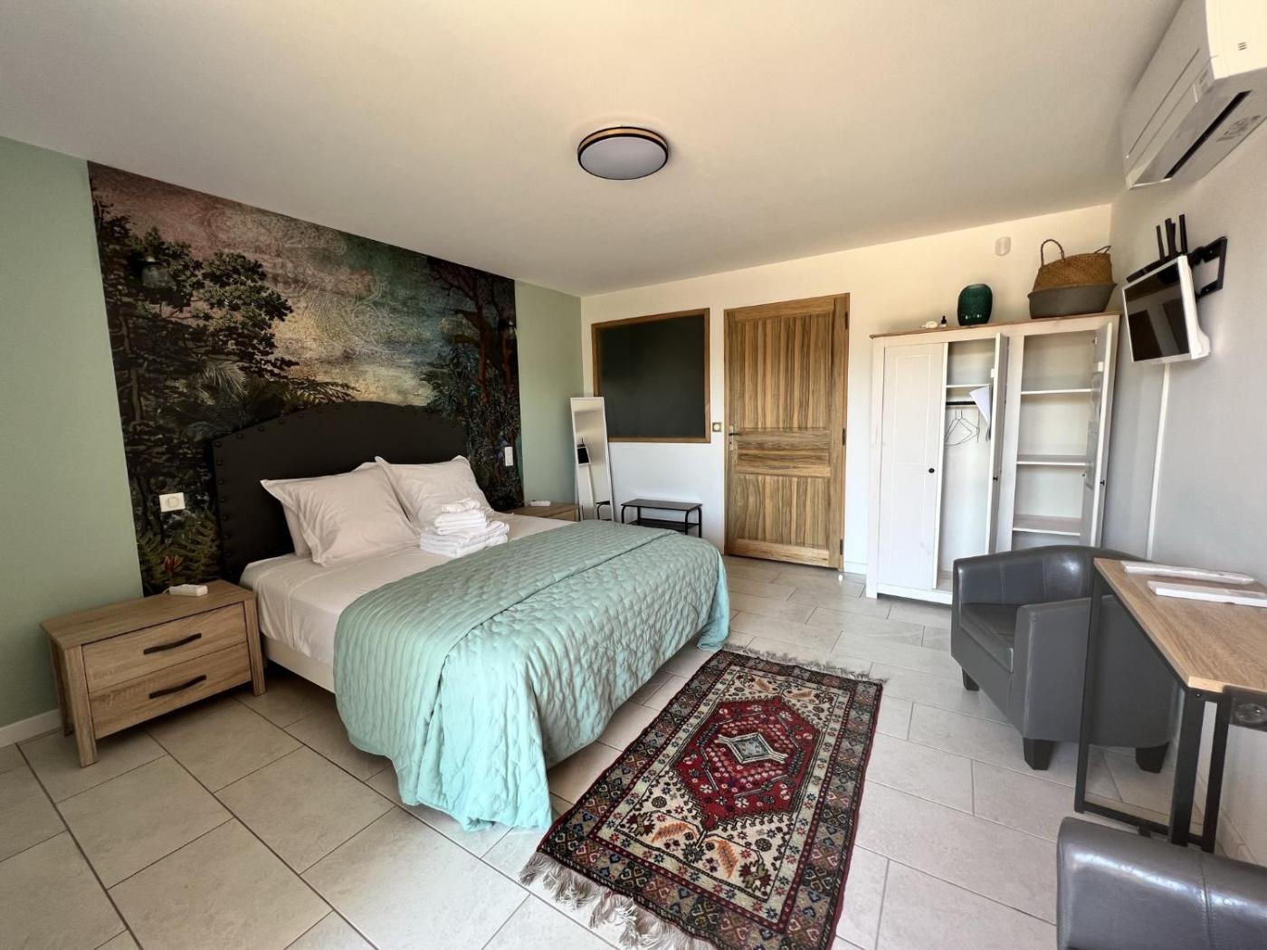 Chambre Standard Lit Queen-Size. The pool with a view and fireplace are the standout features of this double room. Meals can be prepared in the kitchen, which is fitted with a refrigerator, a microwave and a tea and coffee maker. The double room offers air conditioning, soundproof walls, a terrace with garden views as well as a private bathroom boasting a walk-in shower. The unit has 1 bed. ;